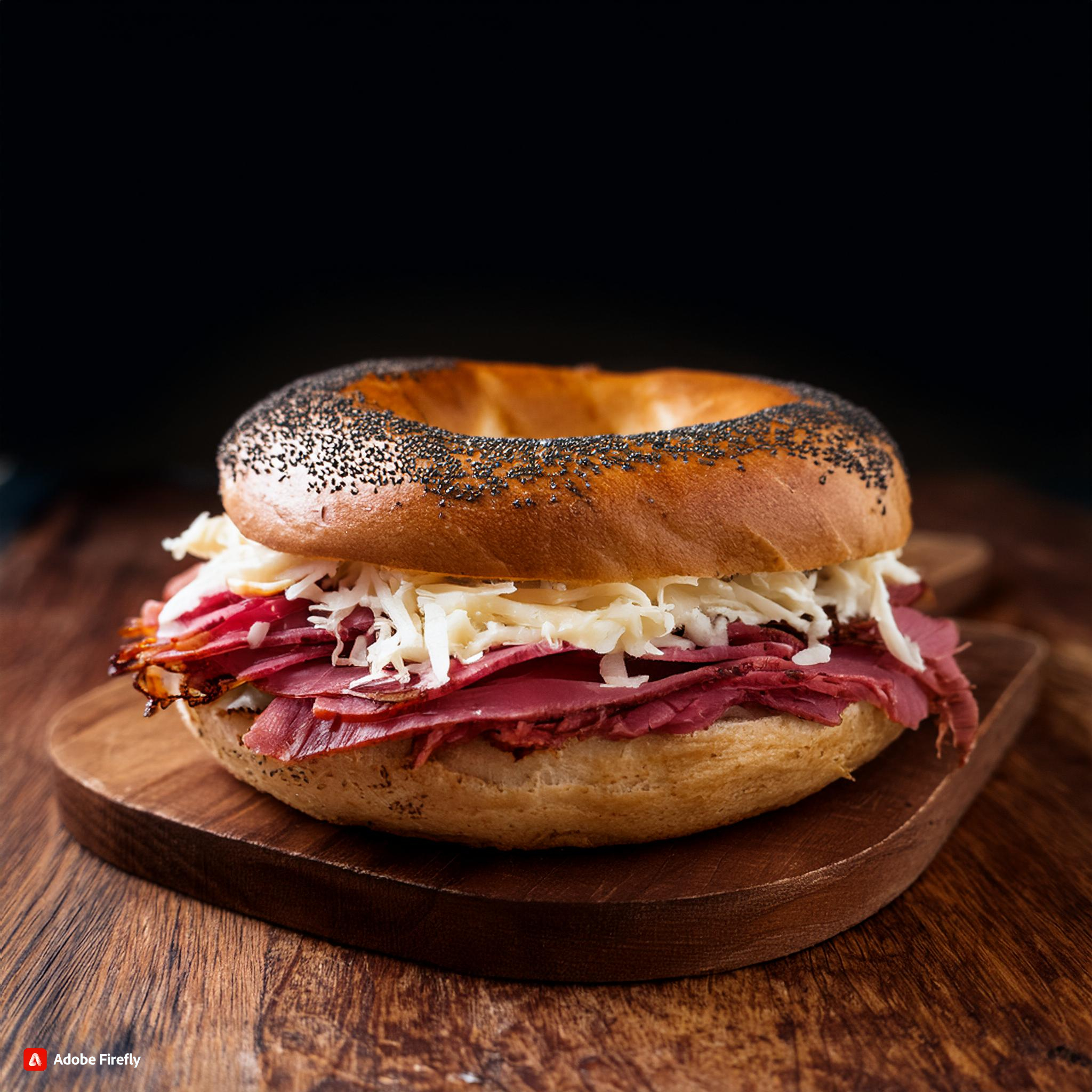 Turkish style soft bagel with shaved beef pastrami, Swiss cheese, Sauerkraut, and secret sauce