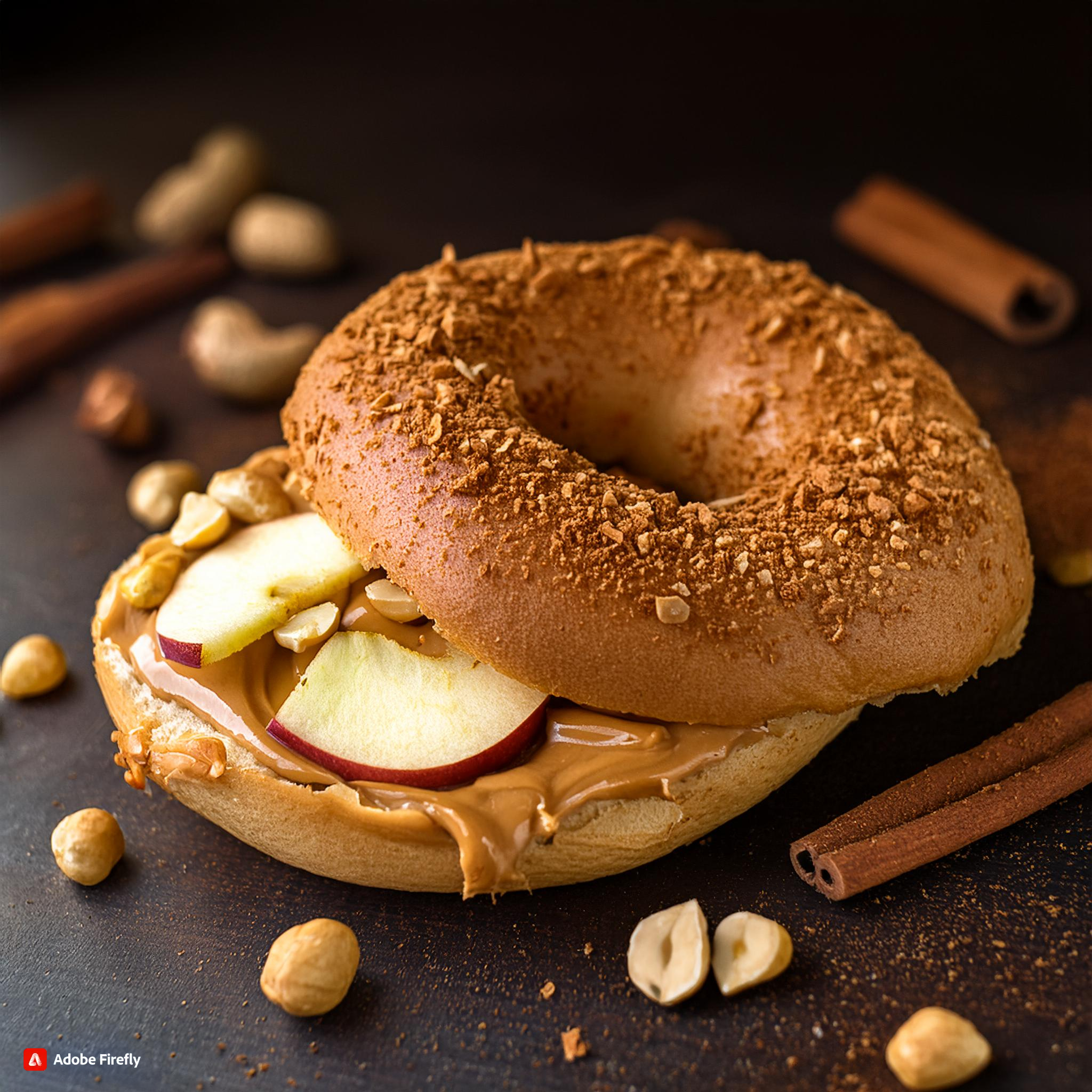 Turkish style soft bagel with peanut butter, apple slices, cinnamon, and roasted hazelnuts crumbs