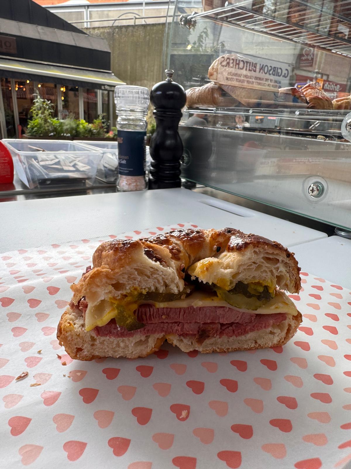 Turkish style soft pastry bagel with beef brisket, swiss cheese, gherkins, mustard and secret sauce