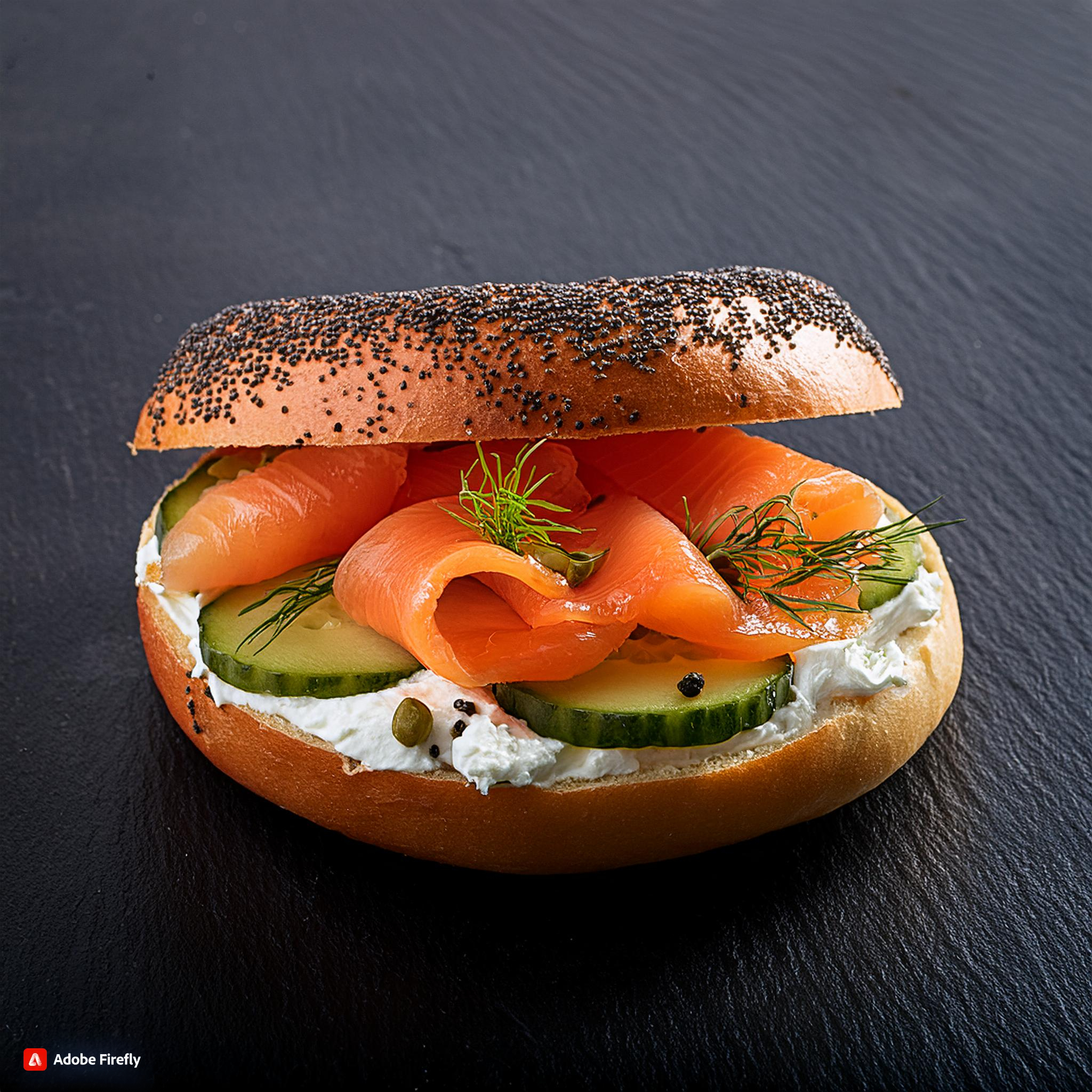 Turkish style soft bagel with salmon, soft cheese with dill and capers, and rondelle cut cucumber