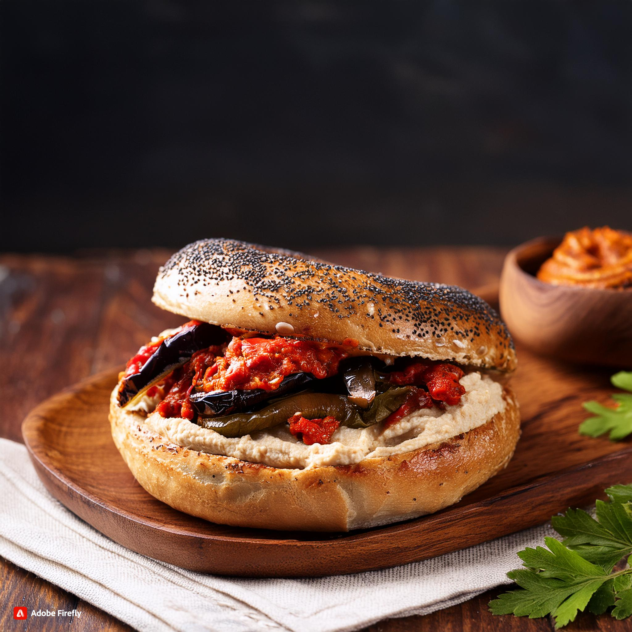 Turkish style soft bagel with hummus, sundried tomatoes, roasted aubergines and Harissa relish